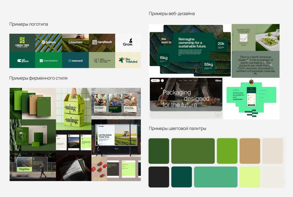 Айдентика будет использоваться на сайте, в соцсетях, на товаре и упаковке, в маркетинговых материалах. Поэтому в референсах мы показали, каким может быть лого, фирменный стиль на печатных носителях и в веб-дизайне.