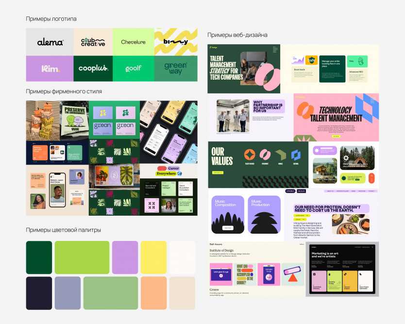 - в цветовой палитре один акцентный травянисто-зеленый или желтый цвет поддерживается темным зеленым и черно-белой базой.