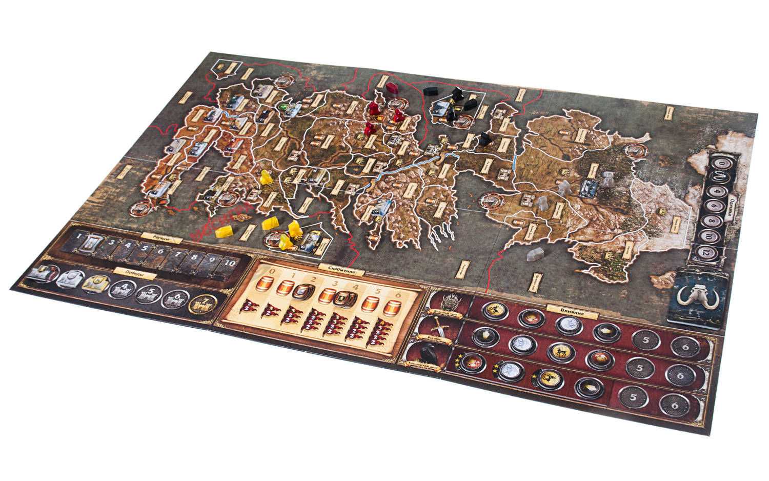Цена очень высокая (4 средних) В этой игре ведут войну 6 Великих Домов (без Таргариенов), каждый за себя. Игра ведётся на большой карте Вестероса, где каждый Дом начинает игру на своём клочке земли. Здесь вся карта поделена на области. Каждая область даёт одно или несколько преимуществ: бонус к сбору войска, бонус к размеру армии, бонус к получению прибыли (власти). В начале каждого раунда каждому войску нужно отдать приказ, но только один: обороняться, совершить набег (с целью диверсии или грабежа), перемещение и нападение, осуществление подкрепления соседним войскам. У каждого Дома есть флот, со своими правилами. Цель игры — первым захватить и удержать 7 крепостей и замков. Для этого нужно захватывать области, которые помогут увеличить ваши войска, удерживать пограничные и захватывать вражеские. Кроме этого есть треки влияния, которые нужно удерживать, так как они дают очень полезные бонусы. Есть ещё много других аспектов, но для краткости я их не стану описывать.