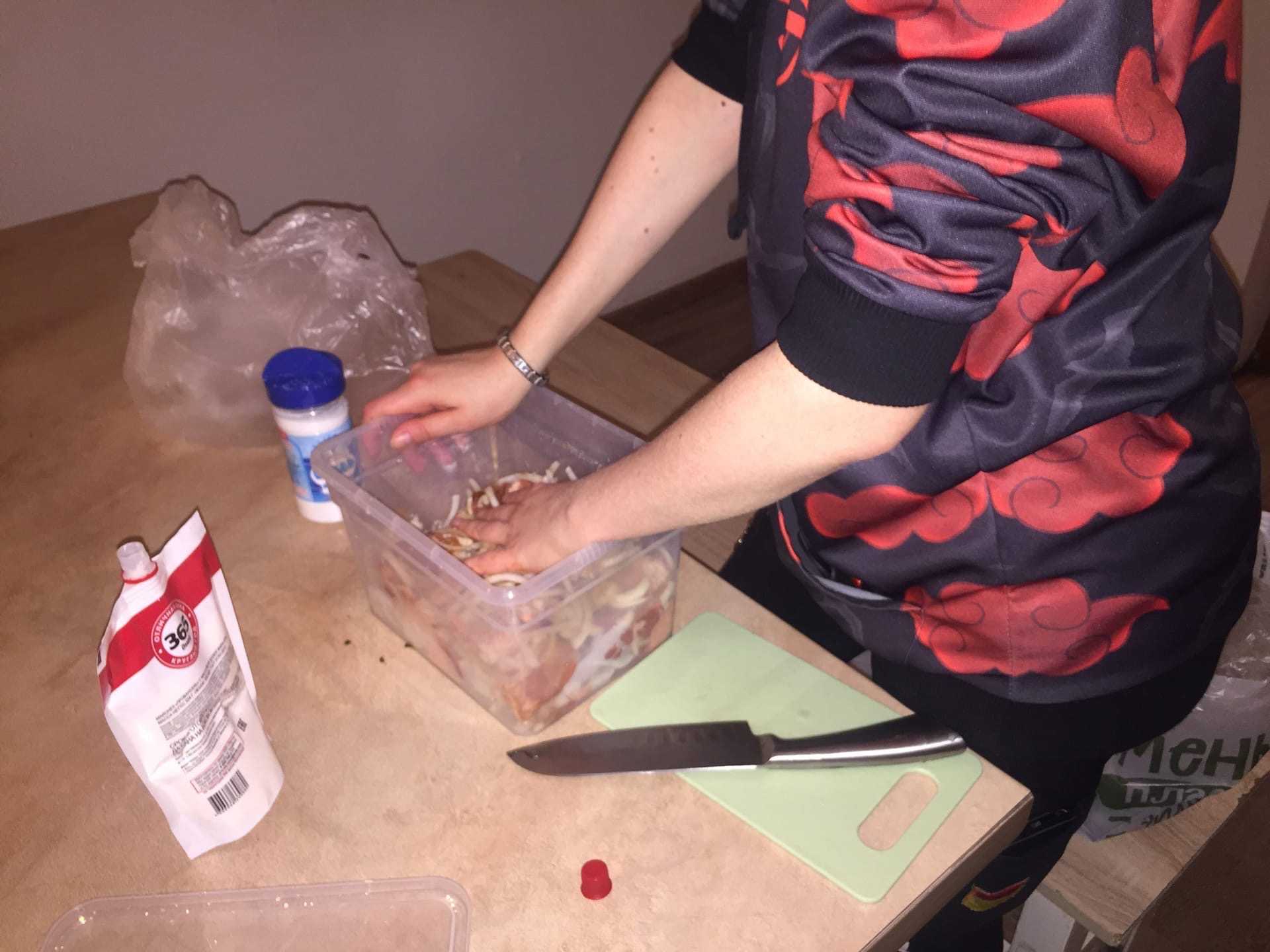 Лук режем полукольцами, добавляем и мнём, чтоб в маринад вытек сок. Майонез я взяла 365 дней, вообще считаю, что по вкусу и консистенции он не отличается от других, так и зачем платить больше?