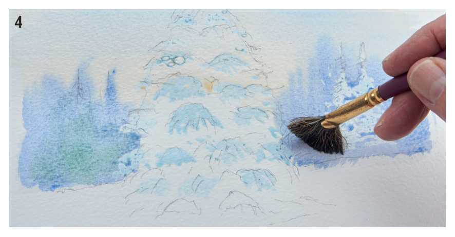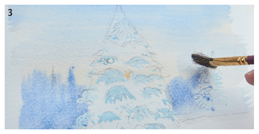 Маскирующей жидкостью изобразите комья снега на ветках ели и два дальних дерева справа. Дайте высохнуть. (1)