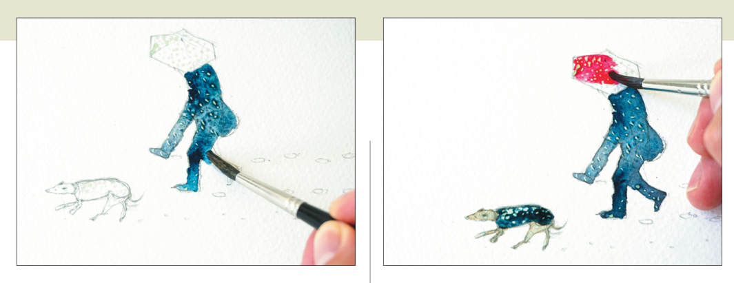 Когда все предыдущие слои высохнут, нарисуйте голову, лапы и хвост гончей разбавленной желтой охрой. На самом деле зонтик был черным, но, если вам кажется, что это добавит выразительности рисунку, реальность можно приукрасить (картинка справа).