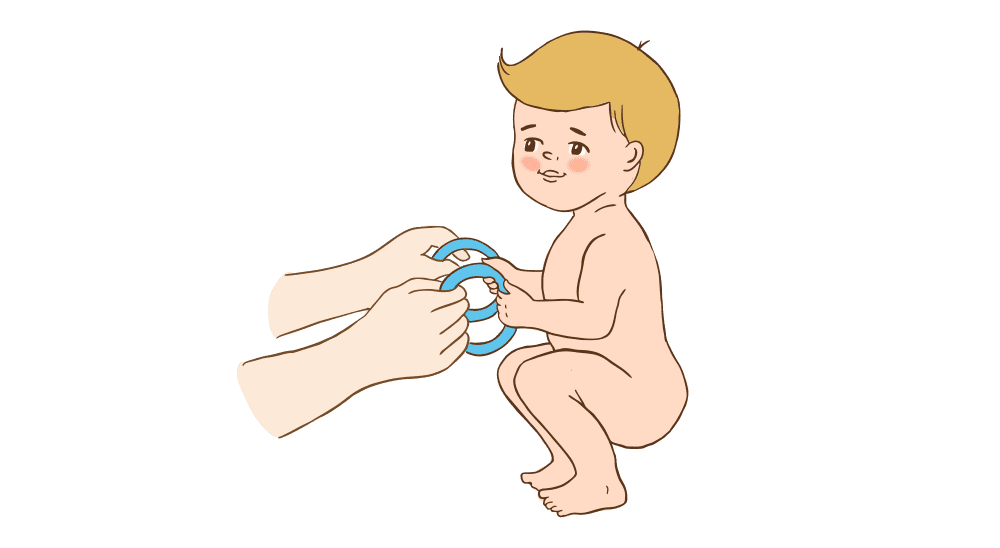 Расположите ребенкастоя, лицом к себе. Дайте ему взяться за ваши руки и попросите присесть, а затем снова встать. В последующем вы можете использовать инвентарь: обручи, палочки, колечки.