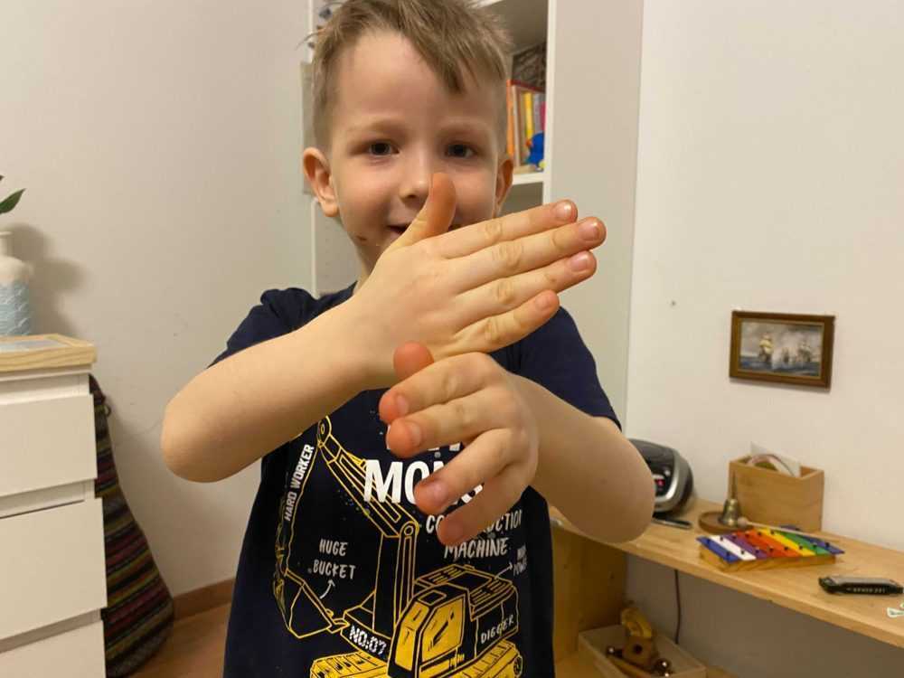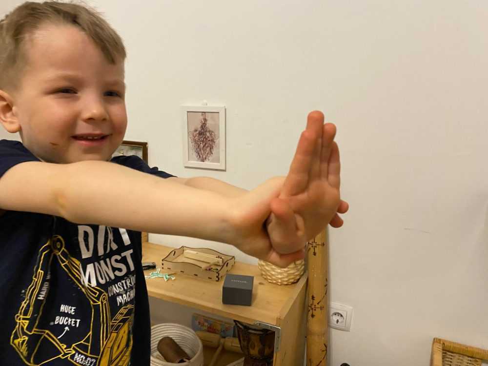 1. Помогаем представить ситуацию с помощью наводящего вопроса: «А бывает так, что кто-то без спроса прикасается к тебе, толкается или даже бьёт?» Ждём, когда ребёнок согласится. Проговариваем, что понимаем, как это обидно, и предлагаем решение. Если он не согласен или молчит, можно добавить: «У меня так бывает, у многих других людей тоже. Давай покажу, что мы делаем в таких случаях».