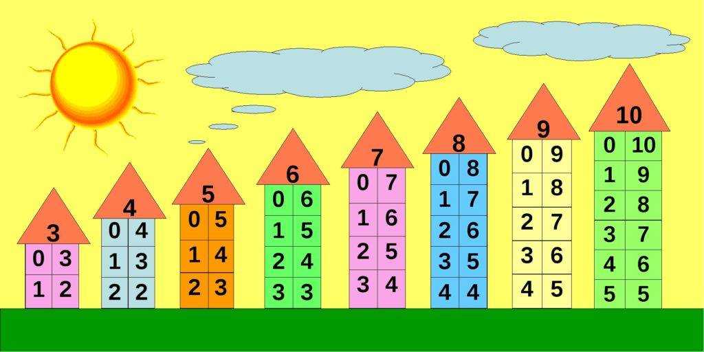 Для закрепления темы хорошо подойдут числовые домики – это следующий этап освоения состава чисел. Домик, где живут цифры, имеет несколько этажей с двумя окошками на каждом. На крыше находится число, которое разбивается на два числа-соседа на каждом этаже. Количество этажей зависит от количества возможных комбинаций, на которые можно разложить требуемое число.