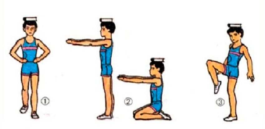 Использовать можно стакан с водой, книгу и так далее. Стоя с предметом на голове, необходимо как можно дольше простоять с ровной осанкой, не уронив предмета.
