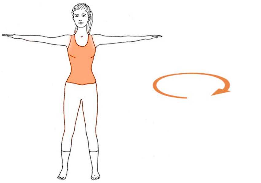 Ноги на ширине плеч. Руки расслаблены. Поворачивать тело вокруг оси, полностью перенося вес тела. Постепенно наращивать интенсивность.