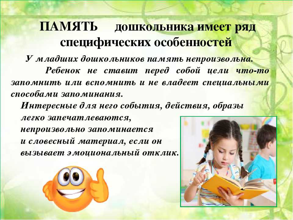 Дошколята задают большое количество вопросов, пытаются ориентироваться в огромных потоках информации. Эти особенности объясняют ту лёгкость, с которой малыши запоминают стихотворения, песни, загадки и считалки, а также всё яркое и заметное. Когда дошкольнику предлагают вспомнить что-либо, то обычно это не составляет для него труда. В этом возрастном периоде ребёнка необходимо одобрять, хвалить за успехи, а также способствовать развитию памяти посредством всевозможных игр, упражнений и занятий.