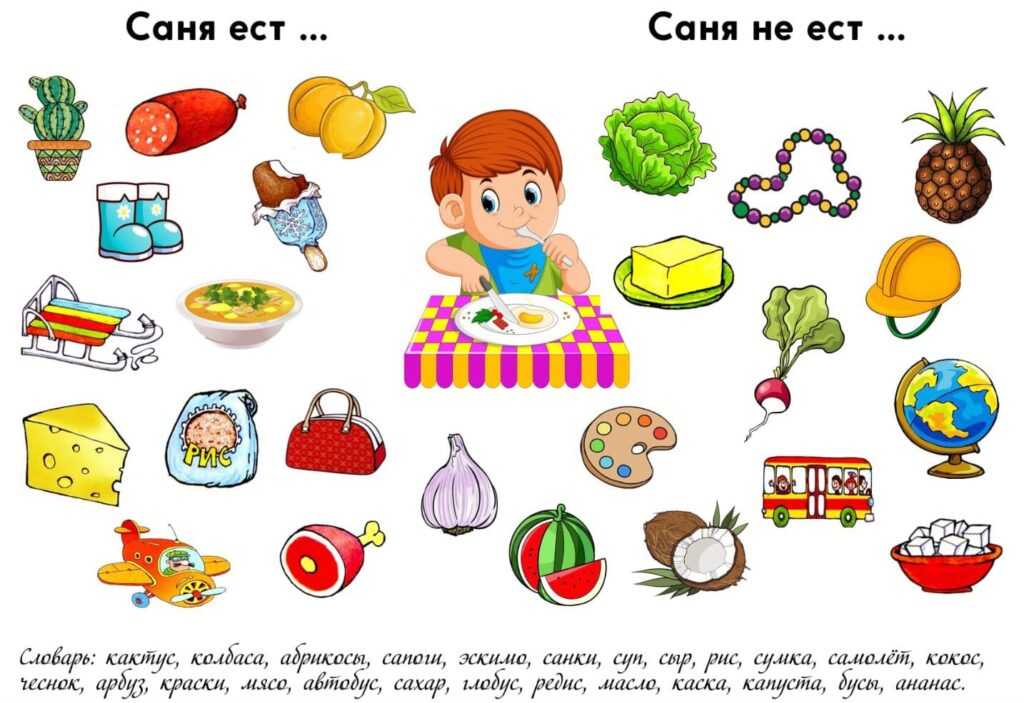 Можно проводить линии съедобных предметов к тарелке, несъедобное — зачеркивать. Или выкладываем камушки: зеленого цвета, то что Саня съест, красного, что не будет есть.