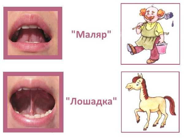 - «Маляр». Ребенок открывает широко рот, как при проговаривании буквы О. С помощью кончика языка пытается покрасить, как кисточкой, потолок (нёбо), пол (область под языком).