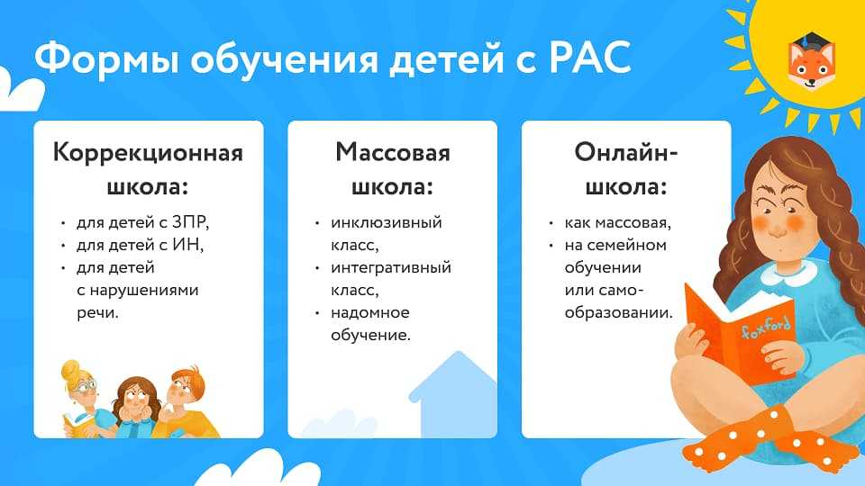 Коррекционных школ для детей исключительно с РАС не существует. Обычно их отправляют туда, где учатся дети с интеллектуальными нарушениями (ИН) или задержкой психического развития (ЗПР) или в так называемую «речевую школу».