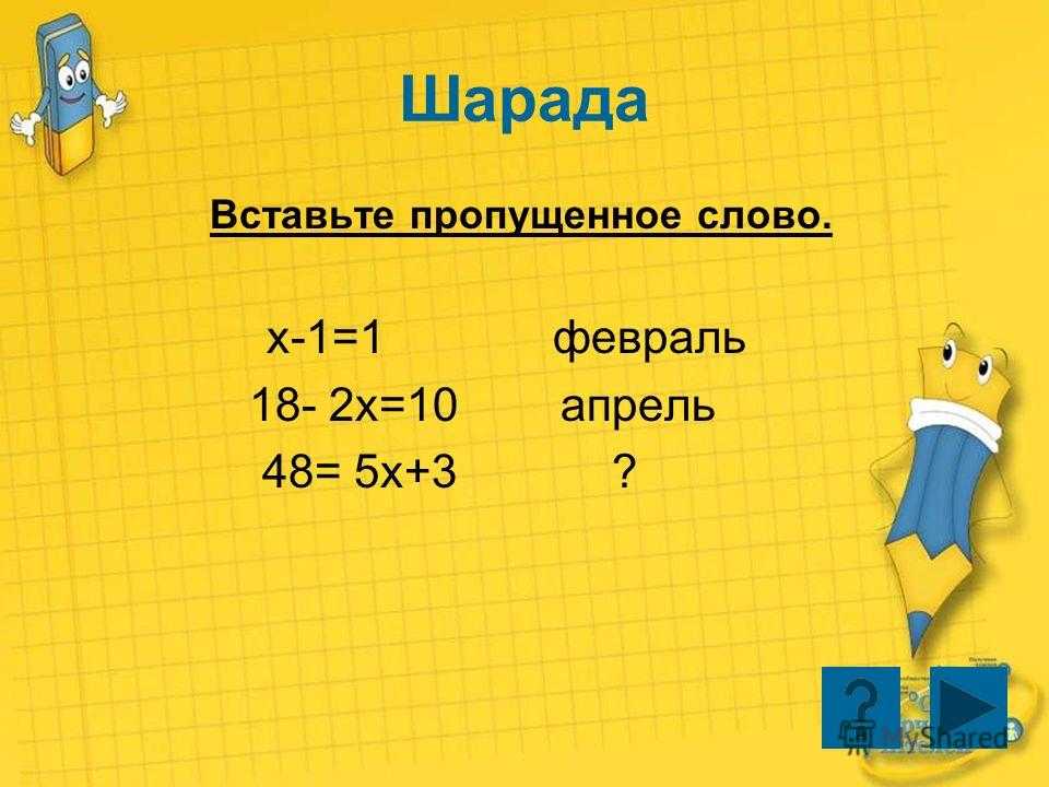 Шарада Вставьте пропущенное слово. x-1=1 февраль 18- 2x=10 апрель 48= 5x+3 ?