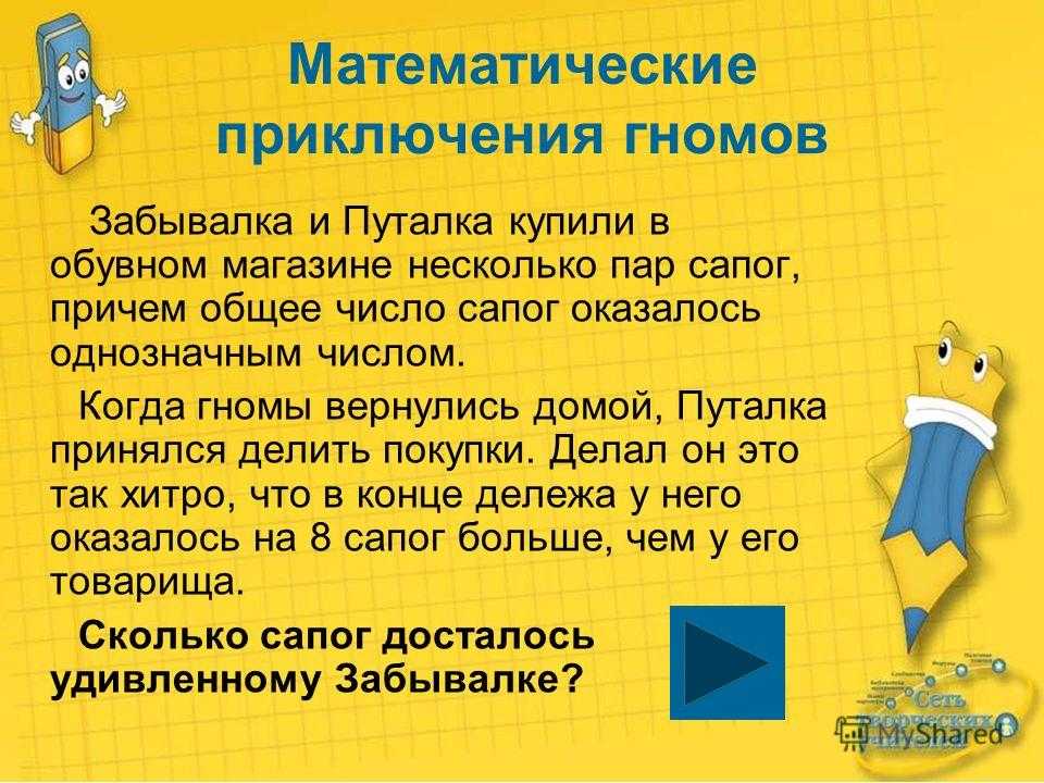 Математические приключения гномов Забывалка и Путалка купили в обувном магазине несколько пар сапог, причем общее число сапог оказалось однозначным числом. Когда гномы вернулись домой, Путалка принялся делить покупки. Делал он это так хитро, что в конце дележа у него оказалось на 8 сапог больше, чем у его товарища. Сколько сапог досталось удивленному Забывалке?