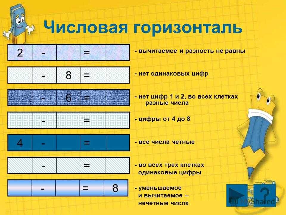 Числовая горизонталь — вычитаемое и разность не равны — нет одинаковых цифр — нет цифр 1 и 2, во всех клетках разные числа — цифры от 4 до 8 — все числа четные — во всех трех клетках одинаковые цифры — уменьшаемое и вычитаемое – нечетные числа 2 -= — 8= — 6= -= 4 -= -= -= 8