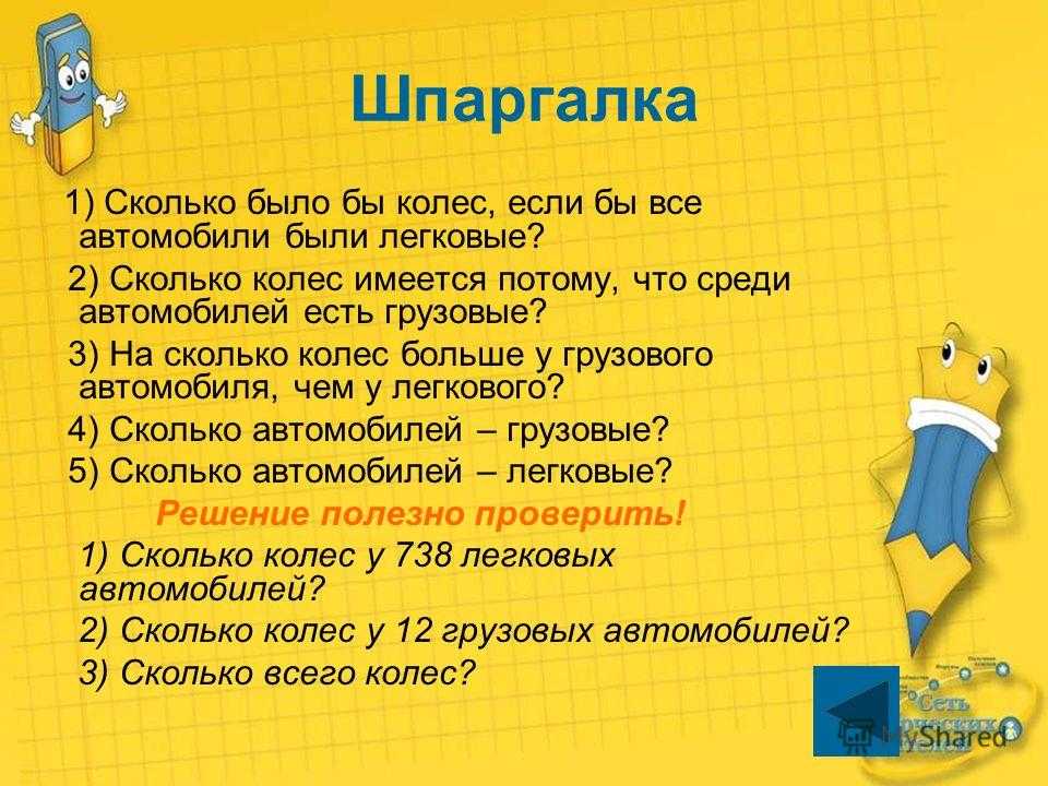Шпаргалка 1) Сколько было бы колес, если бы все автомобили были легковые? 2) Сколько колес имеется потому, что среди автомобилей есть грузовые? 3) На сколько колес больше у грузового автомобиля, чем у легкового? 4) Сколько автомобилей – грузовые? 5) Сколько автомобилей – легковые? Решение полезно проверить! 1) Сколько колес у 738 легковых автомобилей? 2) Сколько колес у 12 грузовых автомобилей? 3) Сколько всего колес?