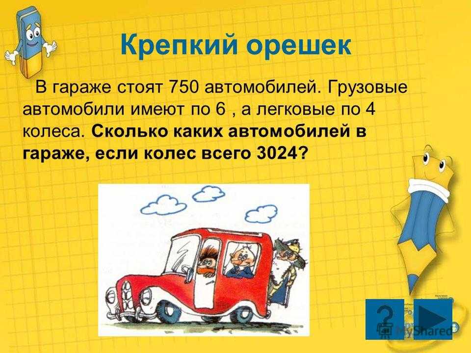 Крепкий орешек В гараже стоят 750 автомобилей. Грузовые автомобили имеют по 6, а легковые по 4 колеса. Сколько каких автомобилей в гараже, если колес всего 3024?