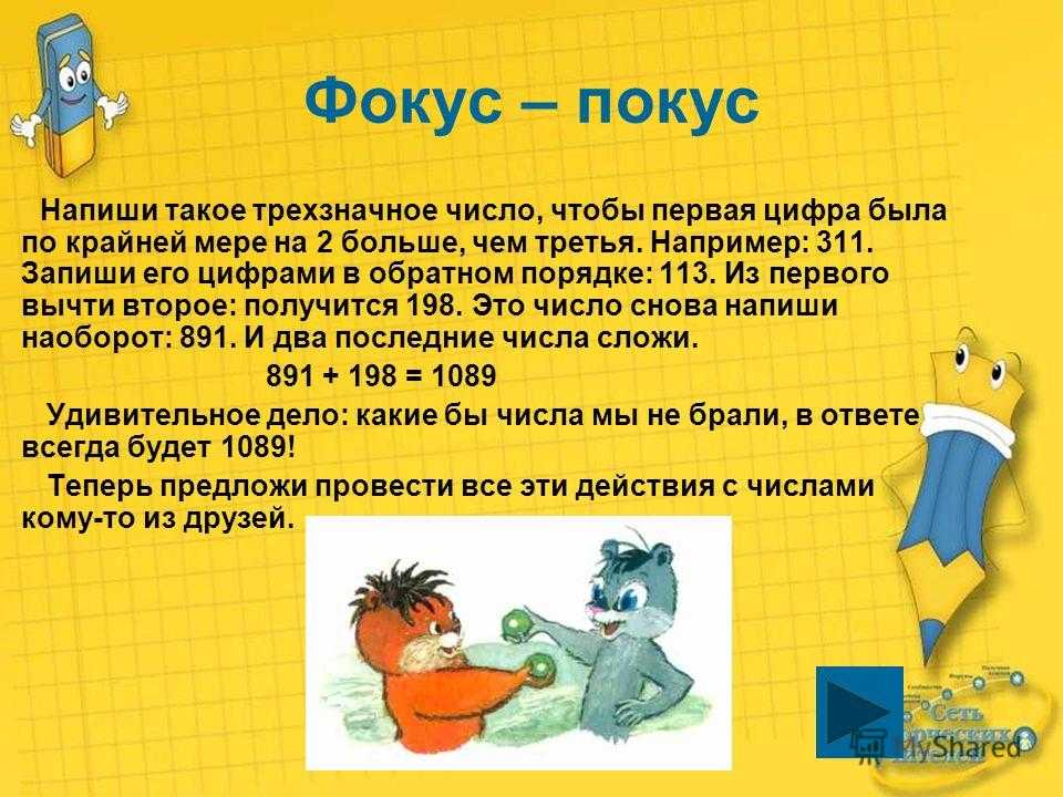 Фокус – покус Напиши такое трехзначное число, чтобы первая цифра была по крайней мере на 2 больше, чем третья. Например: 311. Запиши его цифрами в обратном порядке: 113. Из первого вычти второе: получится 198. Это число снова напиши наоборот: 891. И два последние числа сложи = 1089 Удивительное дело: какие бы числа мы не брали, в ответе всегда будет 1089! Теперь предложи провести все эти действия с числами кому-то из друзей.