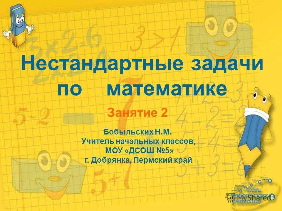 Презентация на тему: » Нестандартные задачи по математике Занятие 2 Бобыльских Н.М. Учитель начальных классов, МОУ «ДСОШ 5» г. Добрянка, Пермский край.» — Транскрипт: