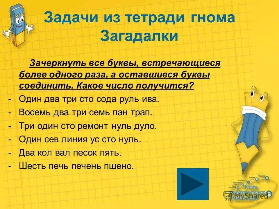 Задачи из тетради гнома Загадалки Зачеркнуть все буквы, встречающиеся более одного раза, а оставшиеся буквы соединить. Какое число получится? -Один два три сто сода руль ива. -Восемь два три семь пан трап. -Три один сто ремонт нуль дуло. -Один сев линия ус сто нуль. -Два кол вал песок пять. -Шесть печь печень пшено.