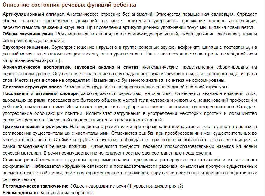 Далее врач составляет логопедическую характеристику, где подробно описывает состояние речевых функций ребенка, выносит заключение о степени ОНР и его клинической форме.