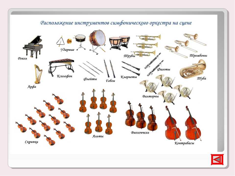 Рассмотри расположение инструментов симфонического оркестра на сцене