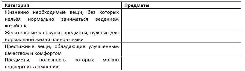 Задание №2: Составь список вещей, необходимых тебе и твоей семье в этом месяце. Попроси родителей помочь тебе. Постарайтесь, чтобы в нем было не менее 10 наименований. Разделите предметы из списка на 4 группы: