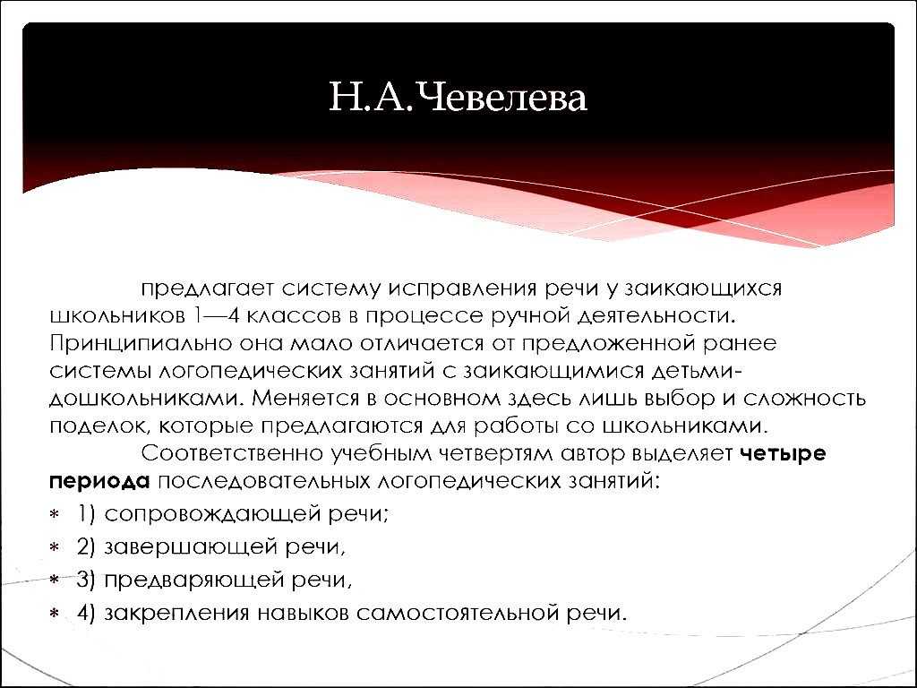 Чевелева предложила своеобразную систему коррекции заикания у дошкольников. Она считала, что в первую очередь, необходимо развивать мелкую моторику рук. По Чевелевой, для лечения ребенок должен заниматься изготовлением поделок. Чем сложнее речь, тем больший объем работы должен будет выполнить малыш.