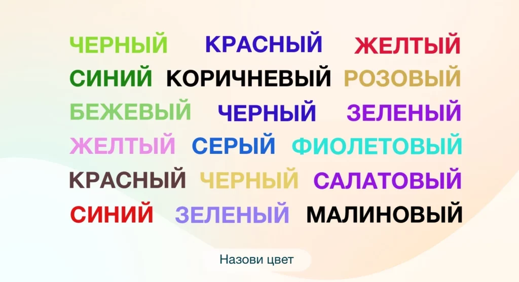 Этот метод также повышает концентрацию внимания и помогает «отвязать» визуальное восприятие слова от его проговаривания. Всё очень просто: нужно назвать сам цвет, а не прочитать слово. Существуют даже настольные игры, основанные на этом методе.