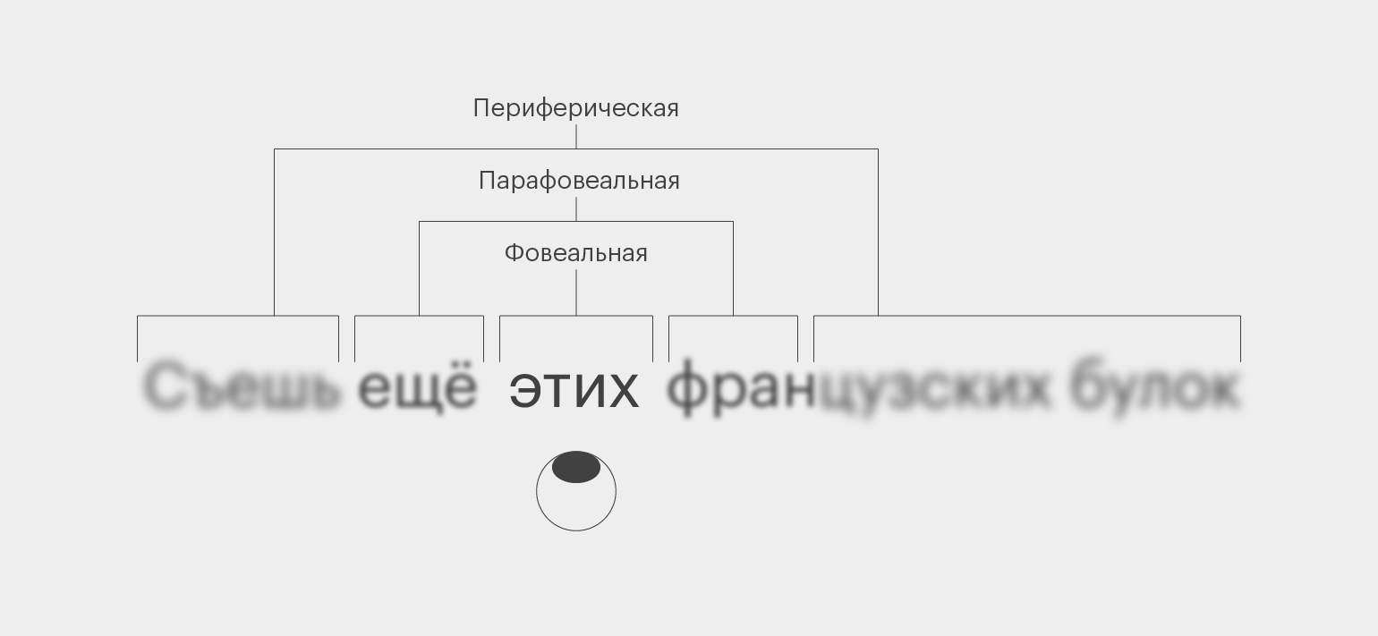 Существует три оптические области, в рамках которых мы видим текст, — фовеальная, парафовеальная и периферическая.