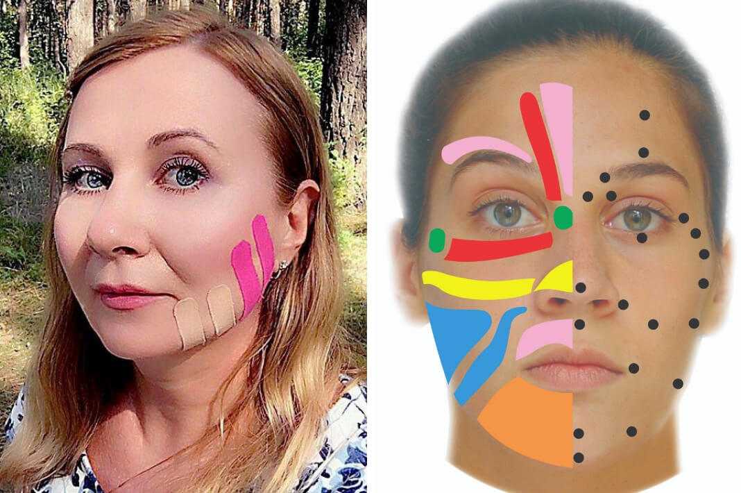 Например, вы делаете специальную гимнастику для лица с целью расслабления этих мышц, а затем тейпируете всю зону на сутки. Тейпом закрепляется результат гимнастики и продлевается терапия этой области на 24 часа.