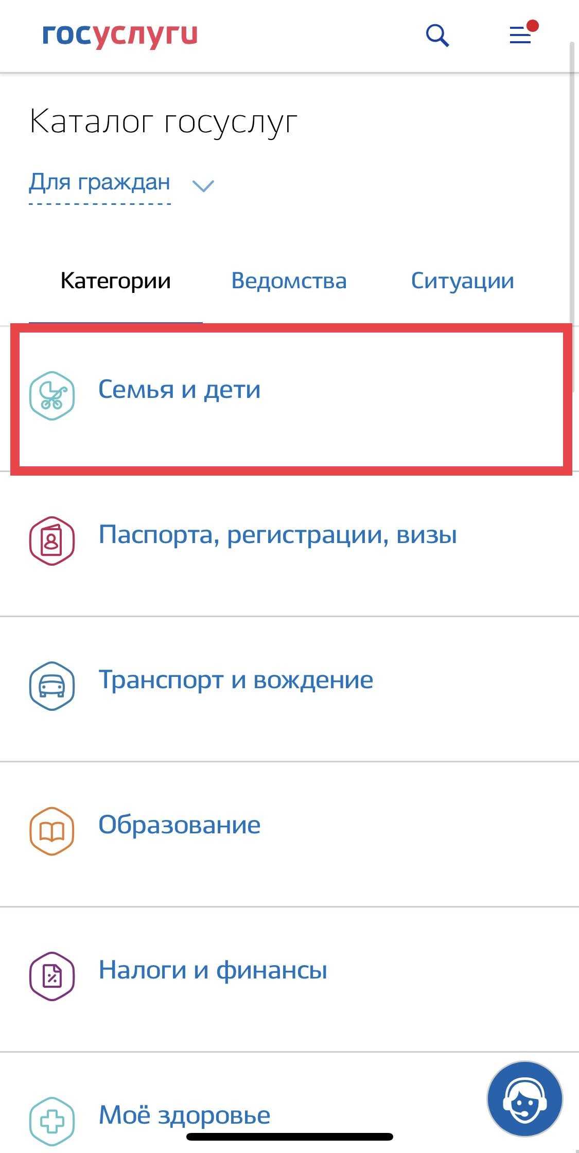 перейти в каталог услуг платформы и выбрать раздел «Семья и дети»;