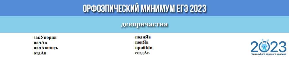 Деепричастий в ЕГЭ 2023 года будет очень мало. Практически во всех словах этой группы ударение приходится на последний слог, кроме двух – «закУпорив» и «начАвшись».