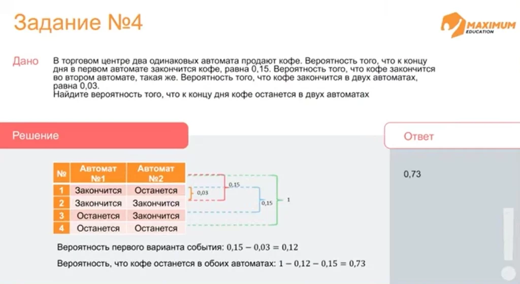 В нашем случае это было задача на автоматы, в которой известна вероятность, что кофе закончится в одном автомате, другом и в обоих. Нужно найти вероятность того, что к концу дня кофе останется в обоих автоматах. Фишка задачи в том, что эти вероятности никак не связаны, автоматы обособлены, поэтому главное — не перемножать события. Тогда искомая вероятность находится по такой логике: