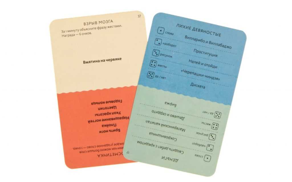 «Алиас». Игрок должен объяснить как можно больше слов за отведенное время. Делать это нужно словами, но обходя стороной те, которые написаны на карточке. Чем больше слов отгадано, тем дальше можно продвинуться по игровому полю.