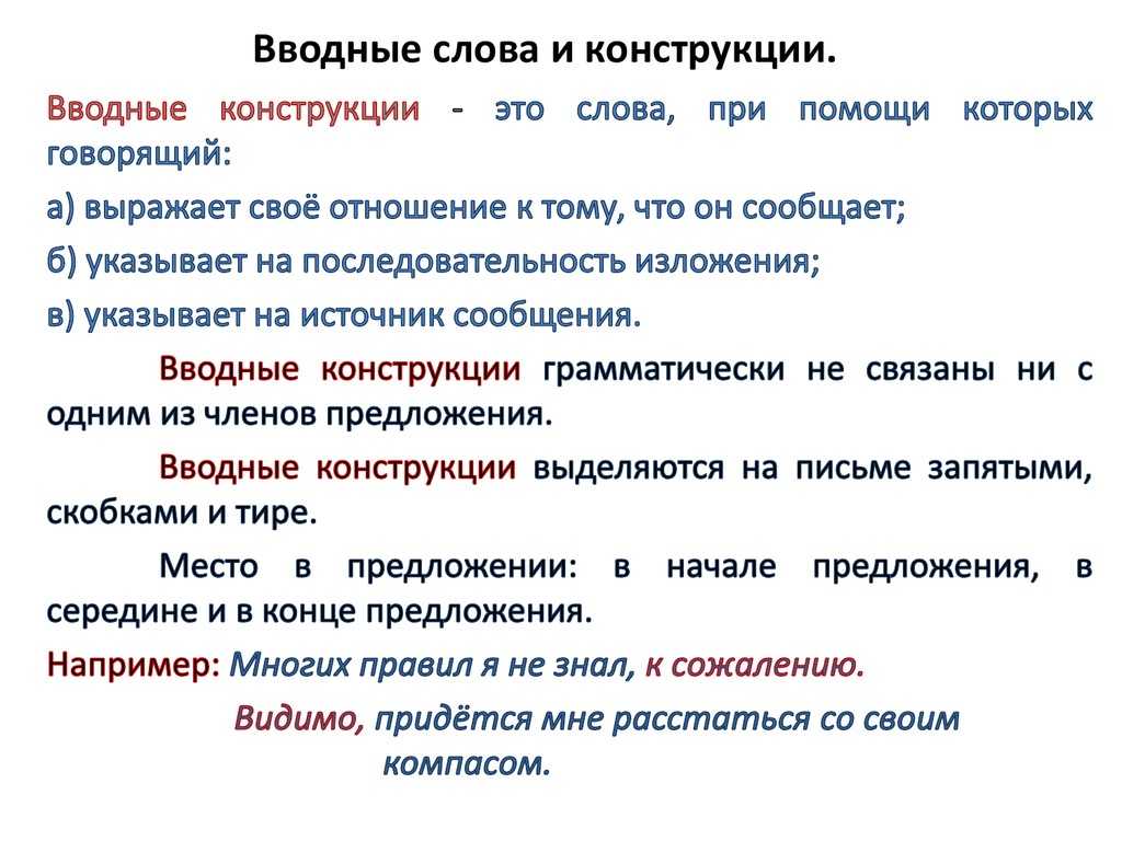 Есть ещё одна подсказка, что перед нами вводная конструкция или слово, — это значение, которое они играют. Основные из них перечислены на картинке чуть выше, а примеры приведены в последующей таблице.
