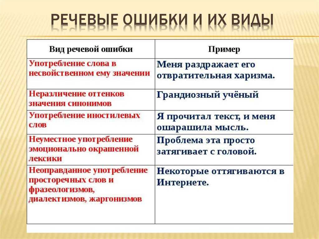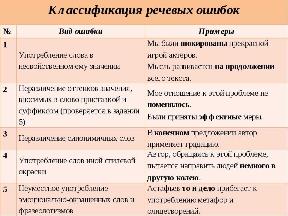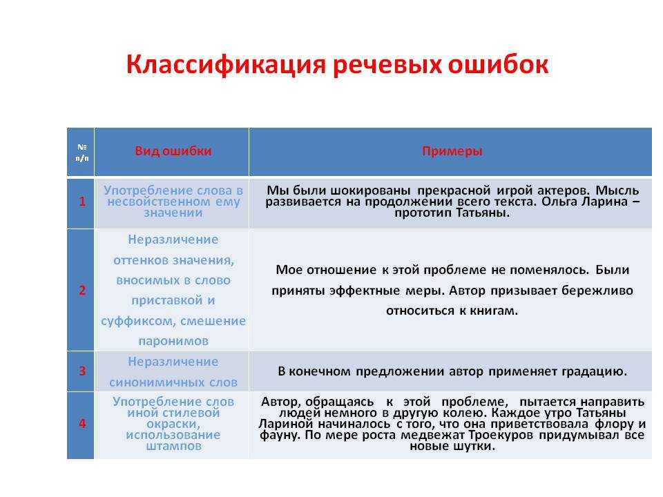 Для наглядности классификация речевых ошибок по видам, с примерами и исправлениями, представлена в таблице: