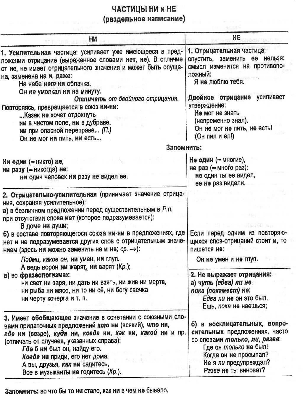 Частицы НЕ и НИ. Частица НЕ может писаться со словами слитно или раздельно, частица НИ пишется раздельно со всеми словами, кроме отрицательных наречий (ниоткуда, нигде) и местоимений без предлога (никого, но ни от кого). Чтобы правильно употреблять частицы НЕ и НИ на письме, необходимо разграничивать их значения.