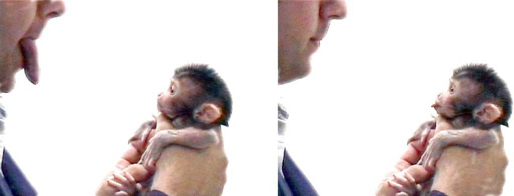 Новорожденный детеныш макаки подражает человеку