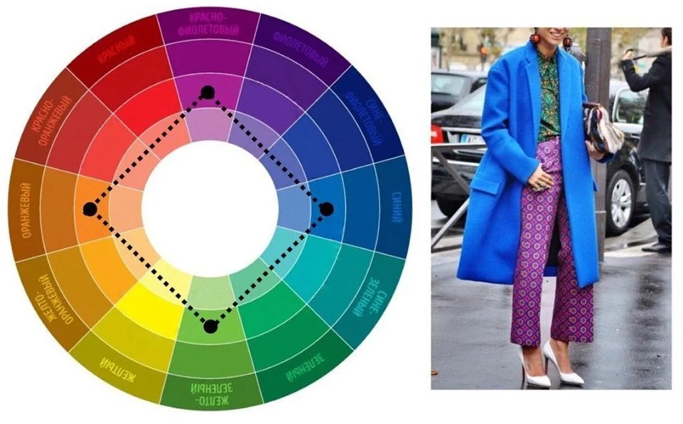 Раздельно-комплементарная цветовая гармония обладает выразительностью и характерностью комплементарной и в то же время утонченностью аналоговой.