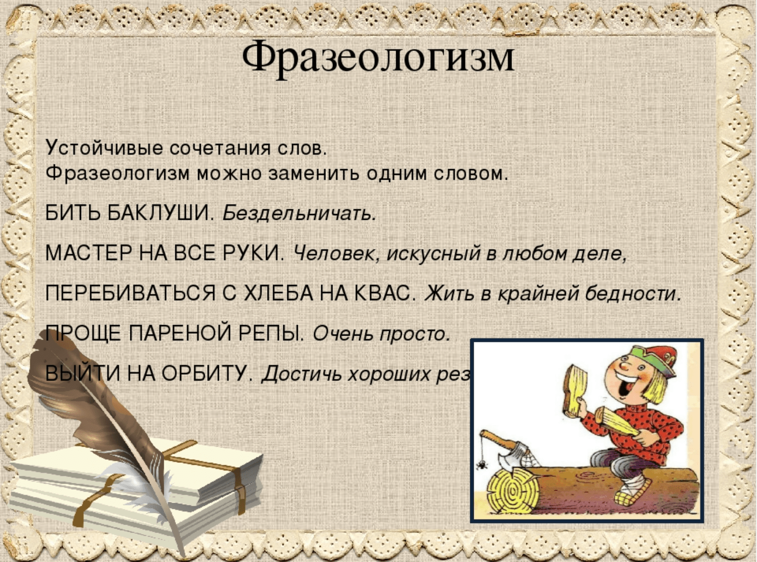 Этим термином называют устойчивые образные выражения. Их суть ясна из смысла составляющих слов. К примеру, выражение «попасться на удочку» будет понятным даже в случае его перевода на другие языки. Суть единства не изменится, если вместо слова «удочка» использовать «крючок». Также смысл будет ясен при добавлении во фразу еще одного слова.