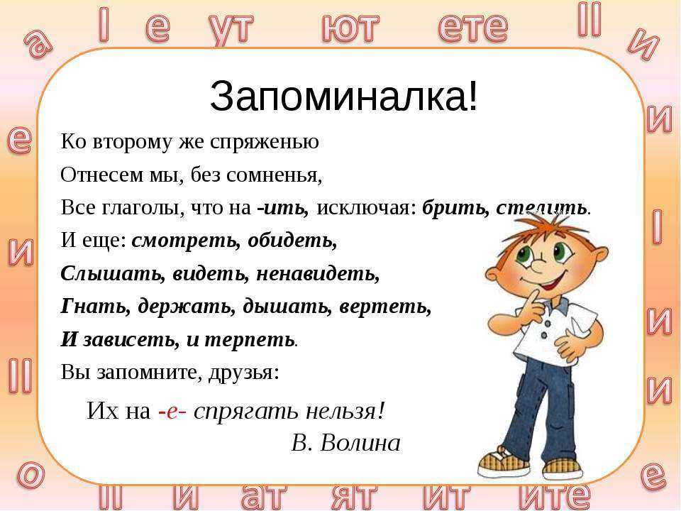 Основным правилом в русском правописании является то, что главным отличием в окончании глаголов первого, а также второго спряжения выступает характер написания. Поскольку в большей части личных окончаний в первом спряжении нужно писать букву «е», в то время как во втором случае, необходимо писать букву «и». Иногда деткам бывает сложно, справится с такими правилами и выучить необходимые слова, поэтому в таких случаях идеальным помощником станут краткие стишки.
