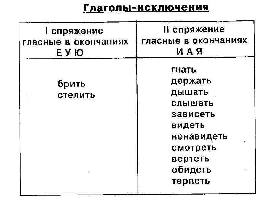 *Глаголы-исключения (относятся ко II спряжению): гнать, держать, дышать, слышать, смотреть, видеть, обидеть, ненавидеть, зависеть, терпеть, вертеть.