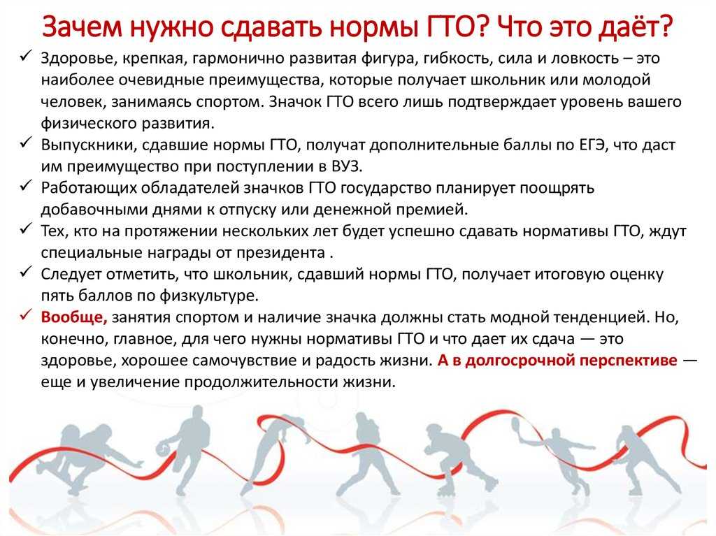 ГТО, или Готов к Труду и Обороне, является важной составляющей жизни школьников. Программа ГТО была разработана с целью развития физической культуры и спорта среди молодежи, и она предоставляет ряд значимых преимуществ, которые помогают школьникам стать более здоровыми и активными