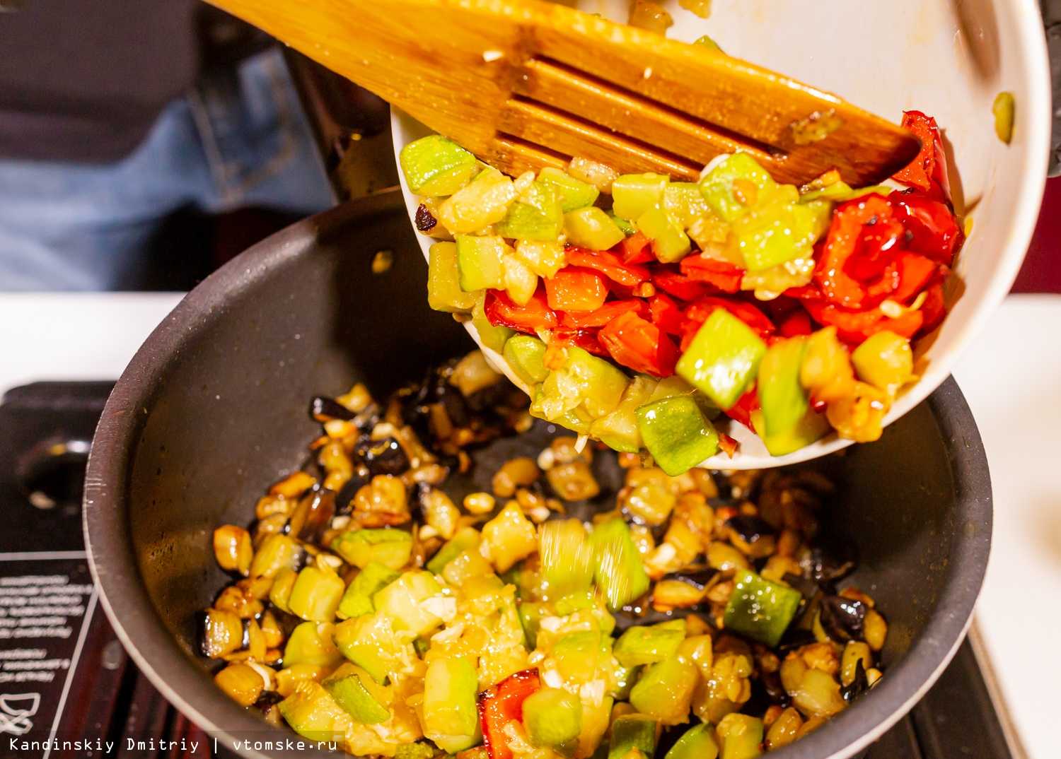 Далее на такие же кубики режем кабачок, лук и перец. На сковороде разогреваем на температуре чуть выше средней растительное масло. Жалеть его не надо, так как оно играет тут важную роль. Если есть оливковое — замечательно, используйте его.