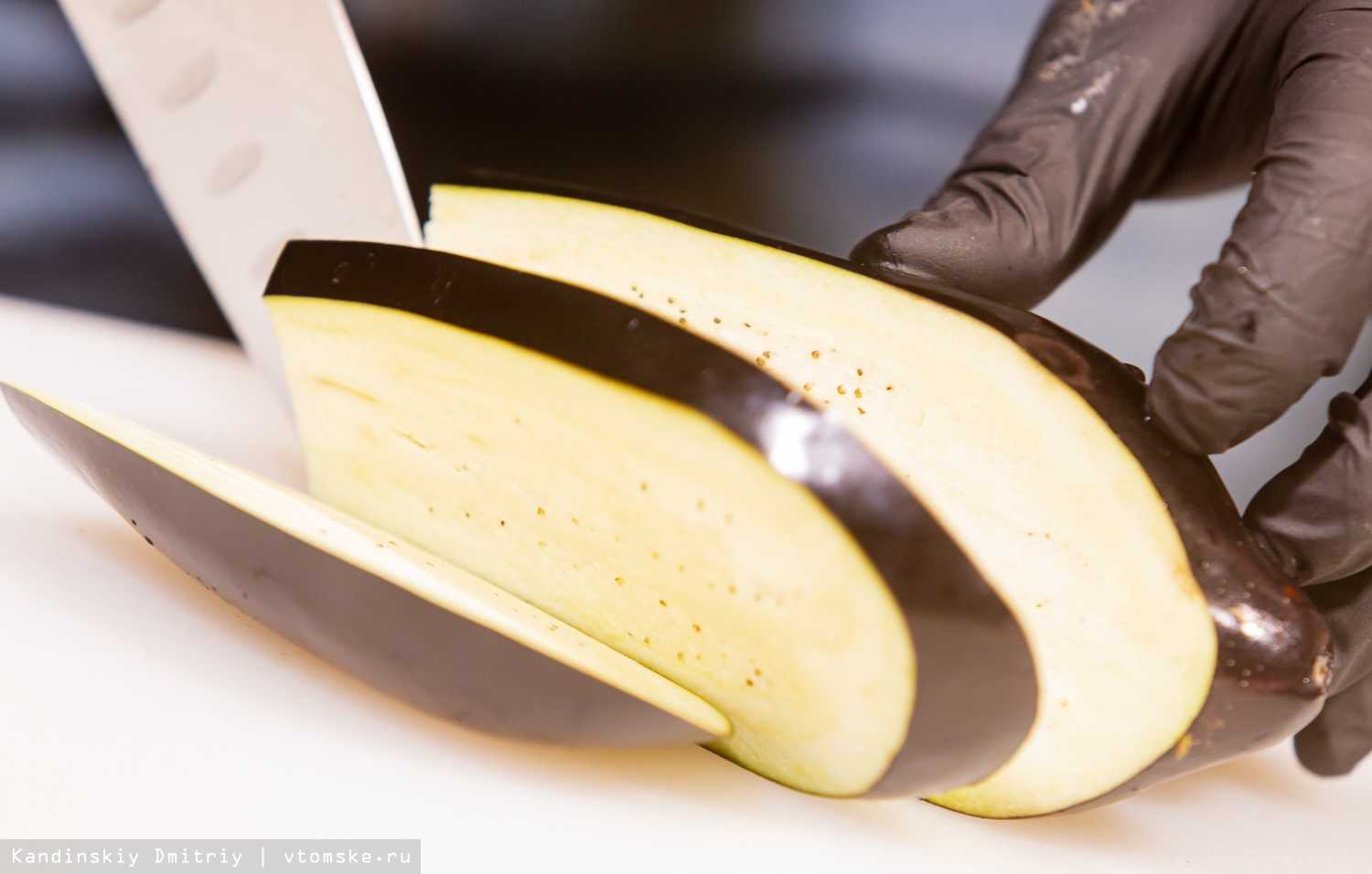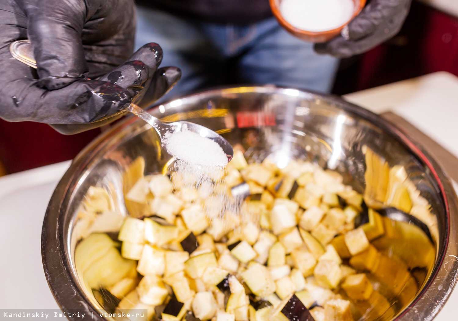 Такой же номер с солью, тимьяном, чесноком, сливом масла и его возвращением проделываем с луком. Последним на очереди идет отжатый баклажан. Его солить не надо — мы делали это в начале. Вновь добавляем тимьян и чеснок.