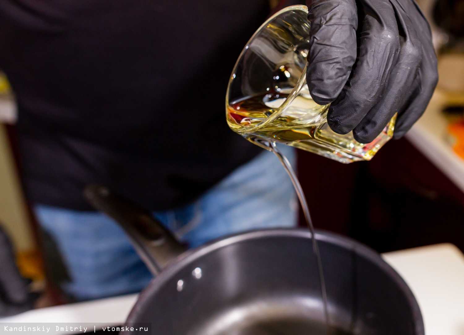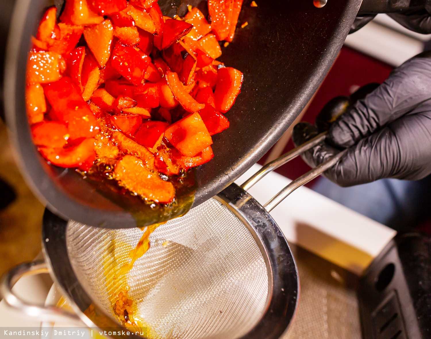 После этого через сито сливаем масло и возвращаем его обратно на сковороду. Перец, естественно, сковородку покидает.